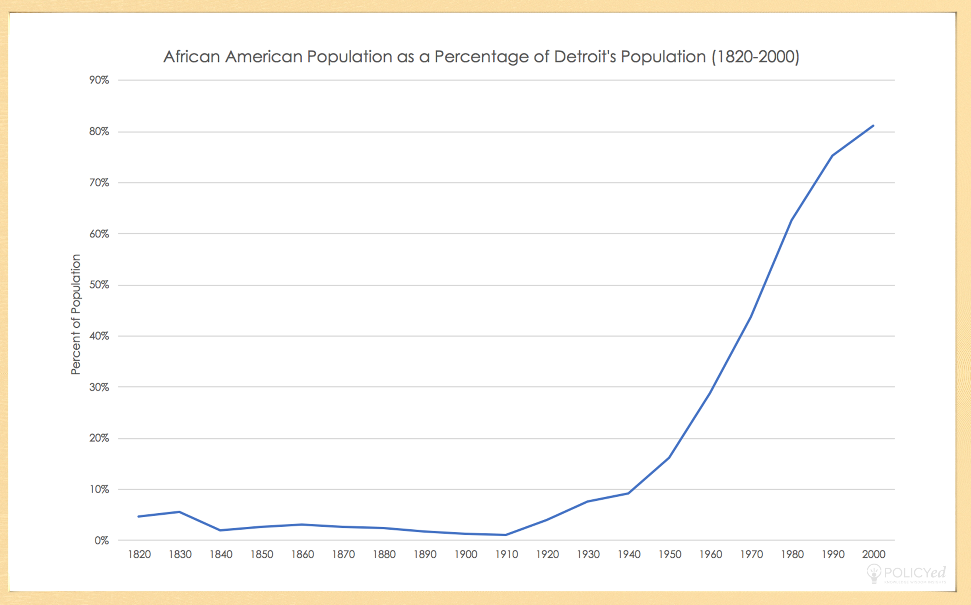 The population growth of Detroit’s African-American population mirrors the general population rise of California, showing that cities like Detroit attracted a sizeable African-American population because of economic opportunities available in manufacturing. This willingness to move where there were opportunities is an American phenomenon, which does not happen as often elsewhere in the world.