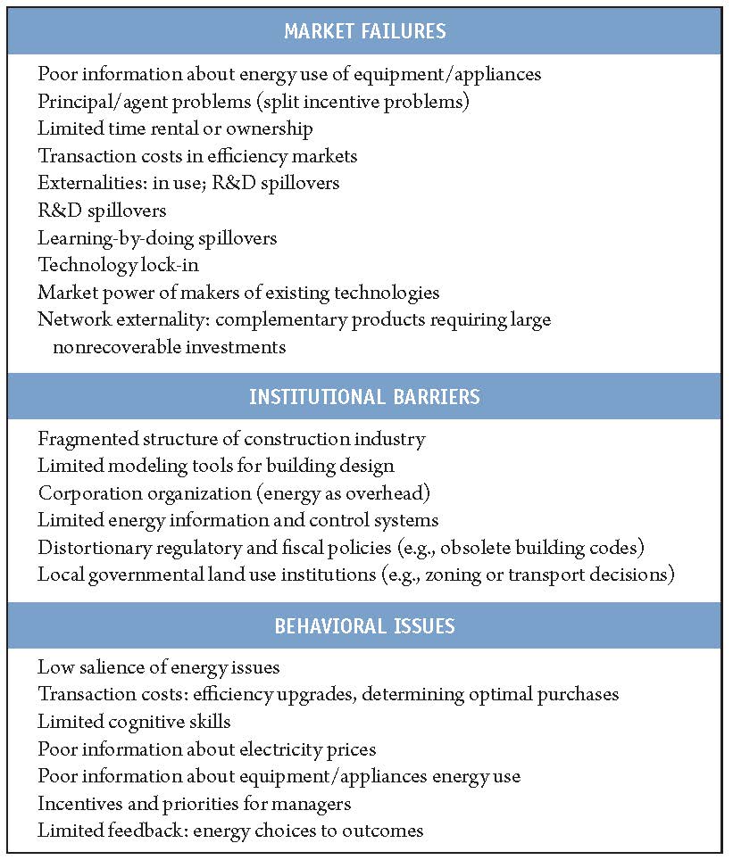Despite the economic, environmental, and security benefits, numerous barriers still prevent full implementation of energy-efficient actions. Those barriers are summarized and listed in terms of market failures, institutional barriers, and behavioral issues in the table below.